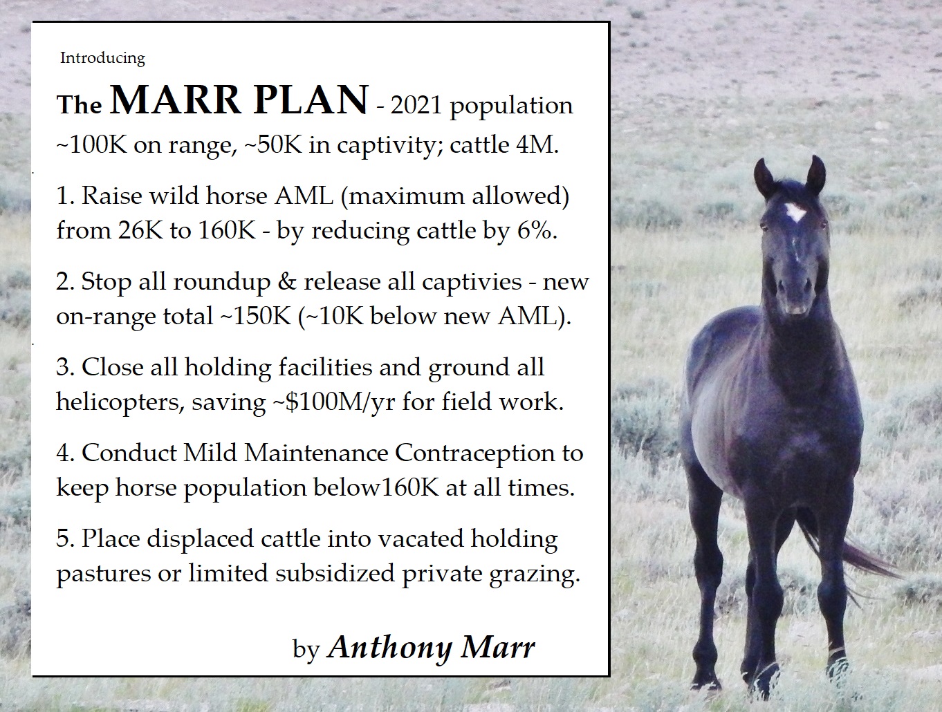 A heart-felt and lasting THANKS to Elizabeth White for tirelessly bringing our alternative wild horse management concept (the “Marr-Downer Plan”) to public attention, and to Annie Mond for asking such a no-nonsense question.